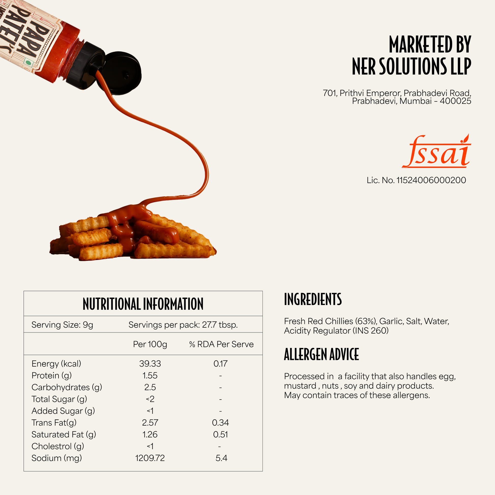 Fresh Red Chillies (63%), Garlic, Salt, Water, Acidity Regulator (INS 260)