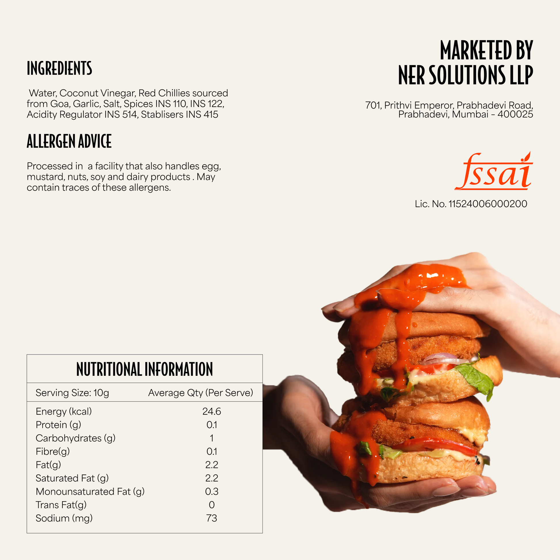 Water, Coconut Vinegar, Red Chillies sourced from Goa, Garlic, Salt, Spices INS 110, INS 122, Acidity Regulator INS 514, Stablisers INS 415