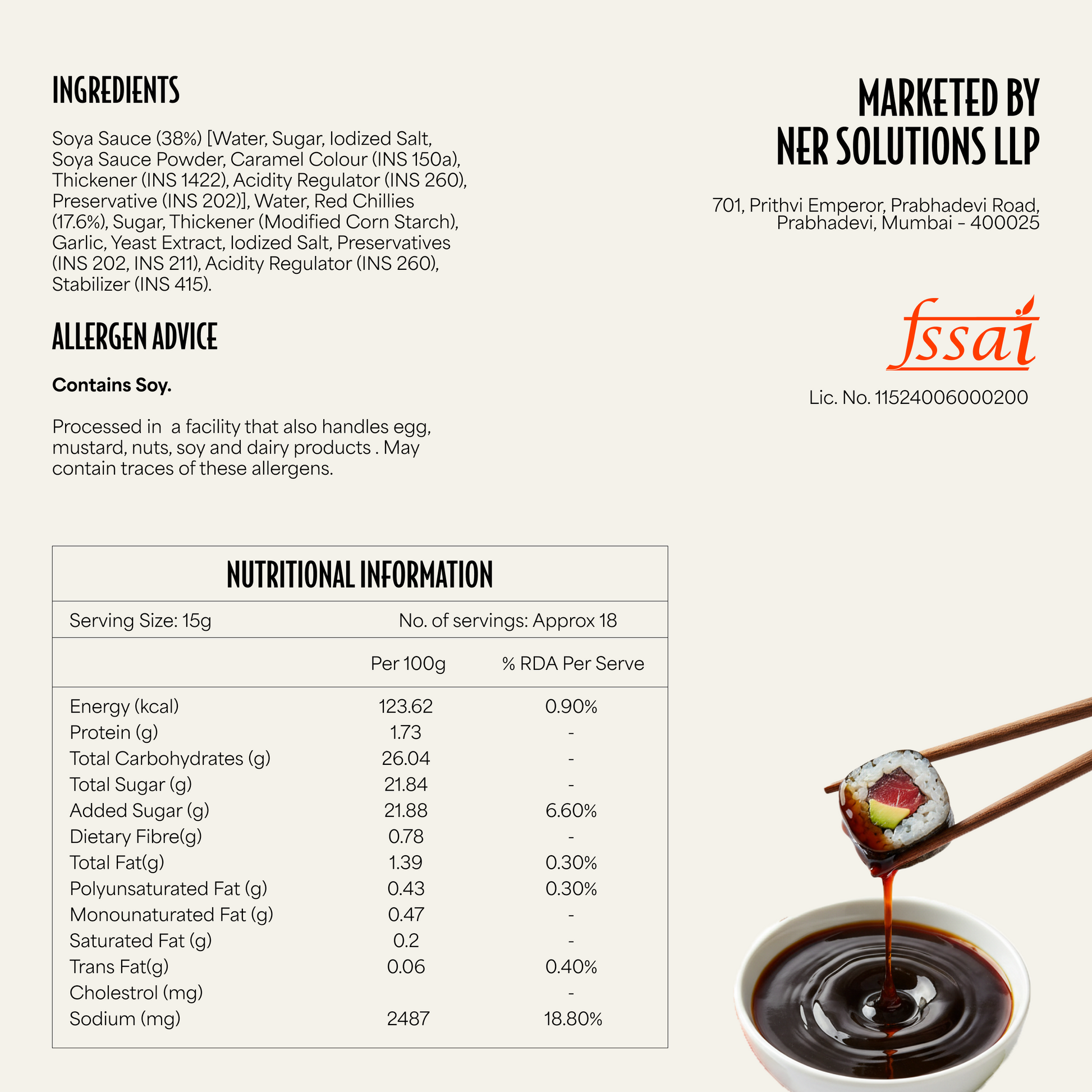 Soya Sauce (38%) [Water, Sugar, Iodized Salt, Soya Sauce Powder, Caramel Colour (INS 150a), Thickener (INS 1422), Acidity Regulator (INS 260), Preservative (INS 202)], Water, Red Chillies (17.6%), Sugar, Thickener (Modified Corn Starch), Garlic, Yeast Extract, Iodized Salt, Preservatives (INS 202, INS 211), Acidity Regulator (INS 260), Stabilizer (INS 415).