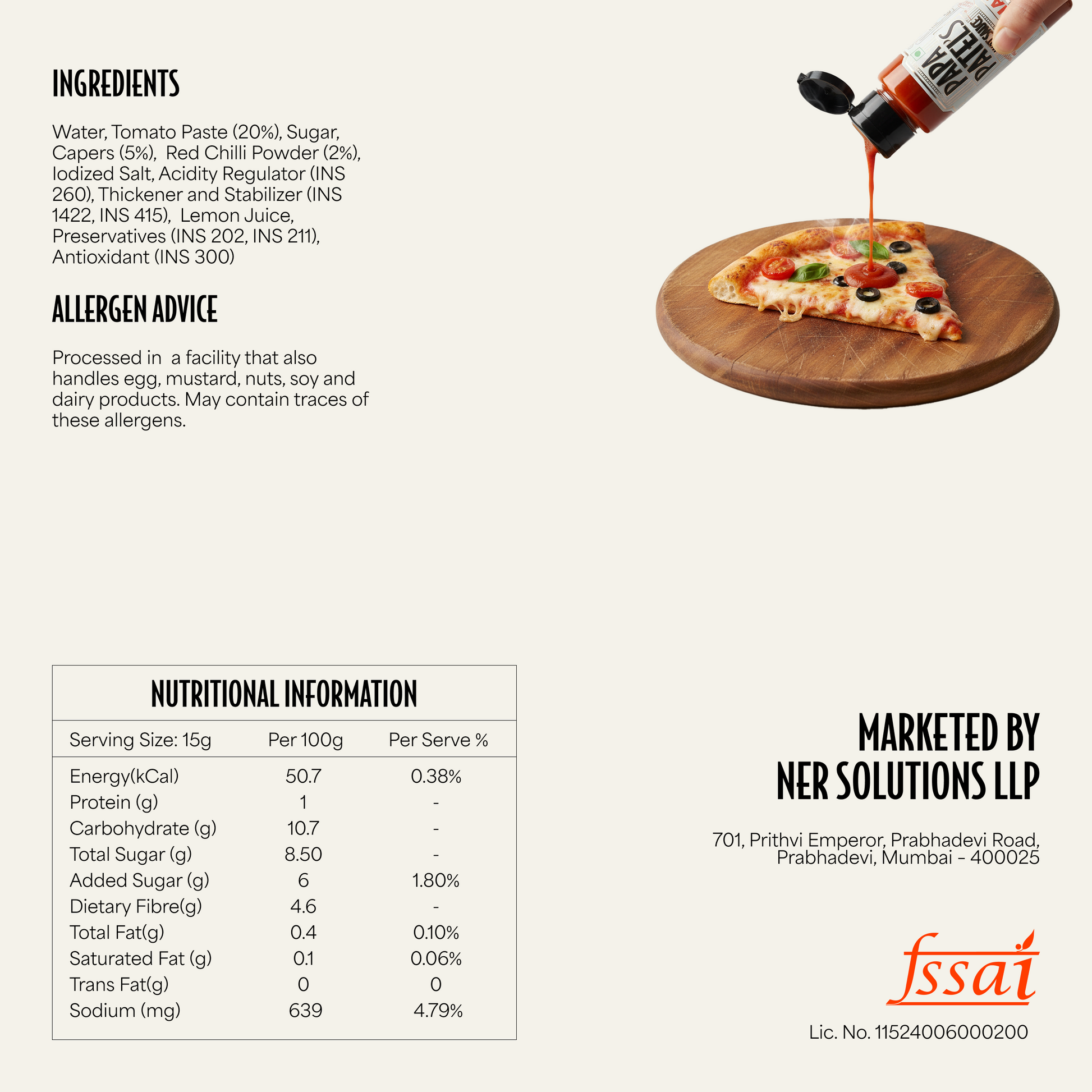 Water, Tomato Paste (20%), Sugar, Capers (5%), Red Chilli Powder (2%), Iodized Salt, Acidity Regulator (INS 260), Thickener and Stabilizer (INS 1422, INS 415), Lemon Juice, Preservatives (INS 202, INS 211), Antioxidant (INS 300)